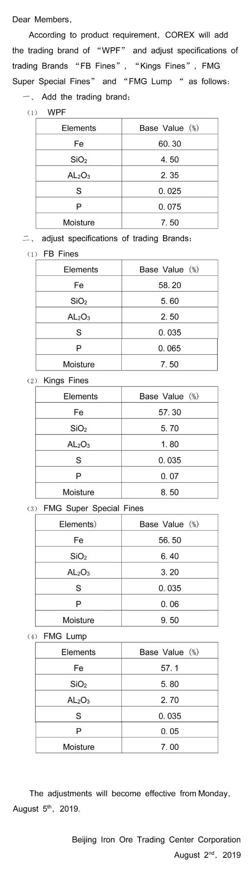 Notice on Closing Arrangement of COREX System during Mid-Autumn Festival and National Day Holidays in 2019 Announcement for Adjustment of Trading Brands